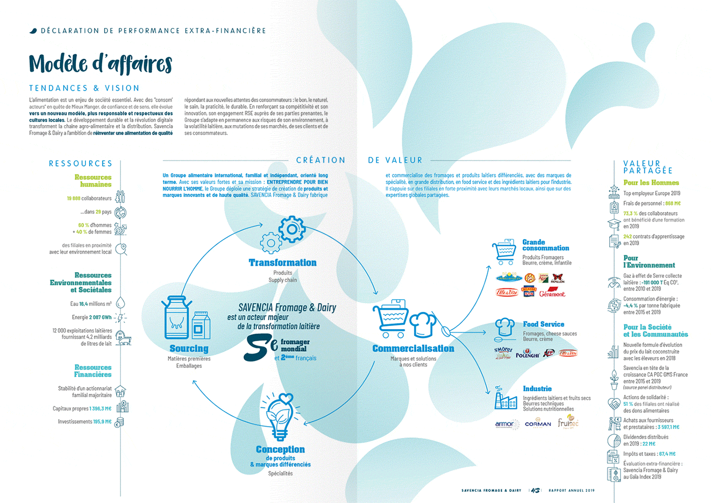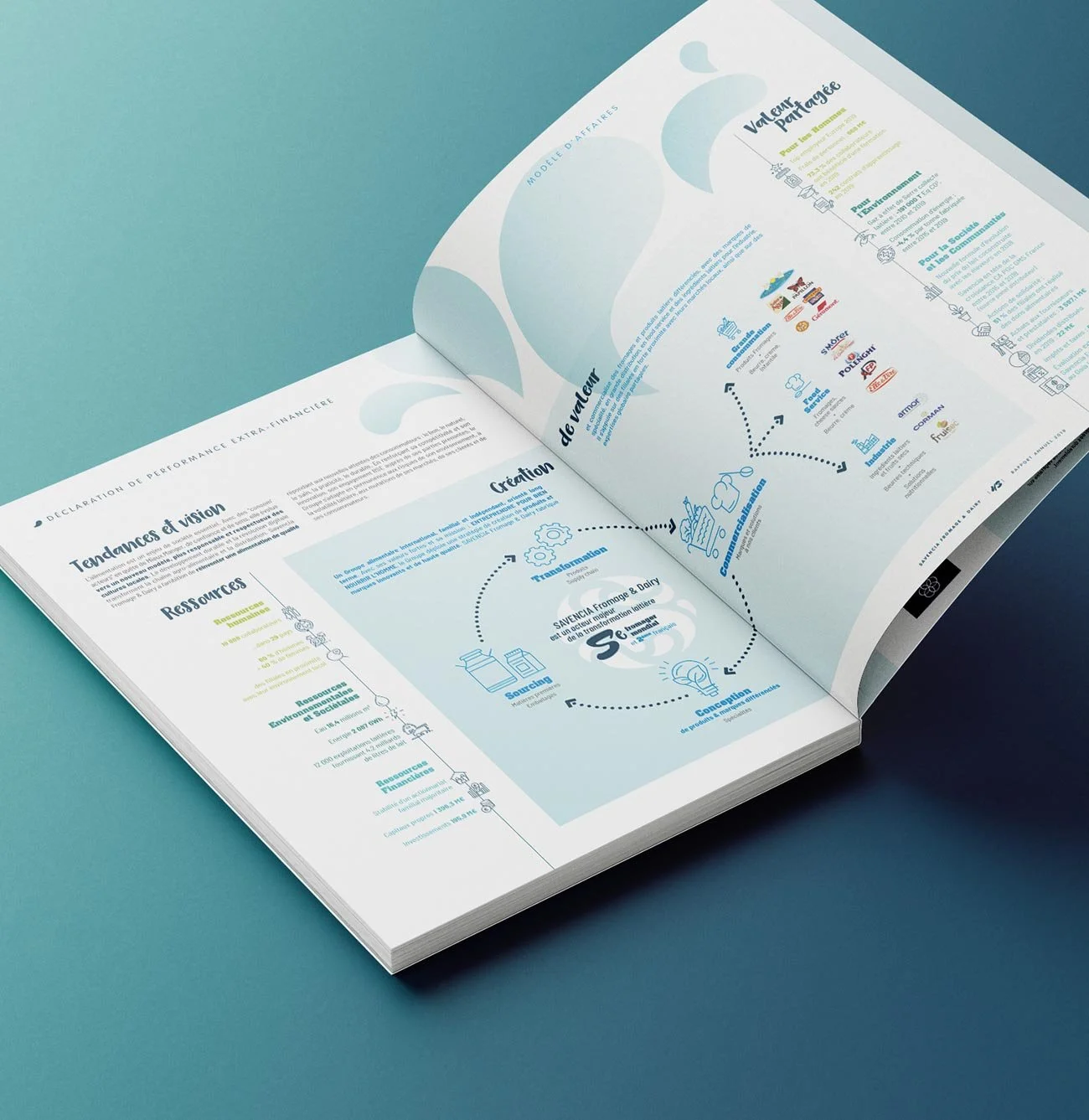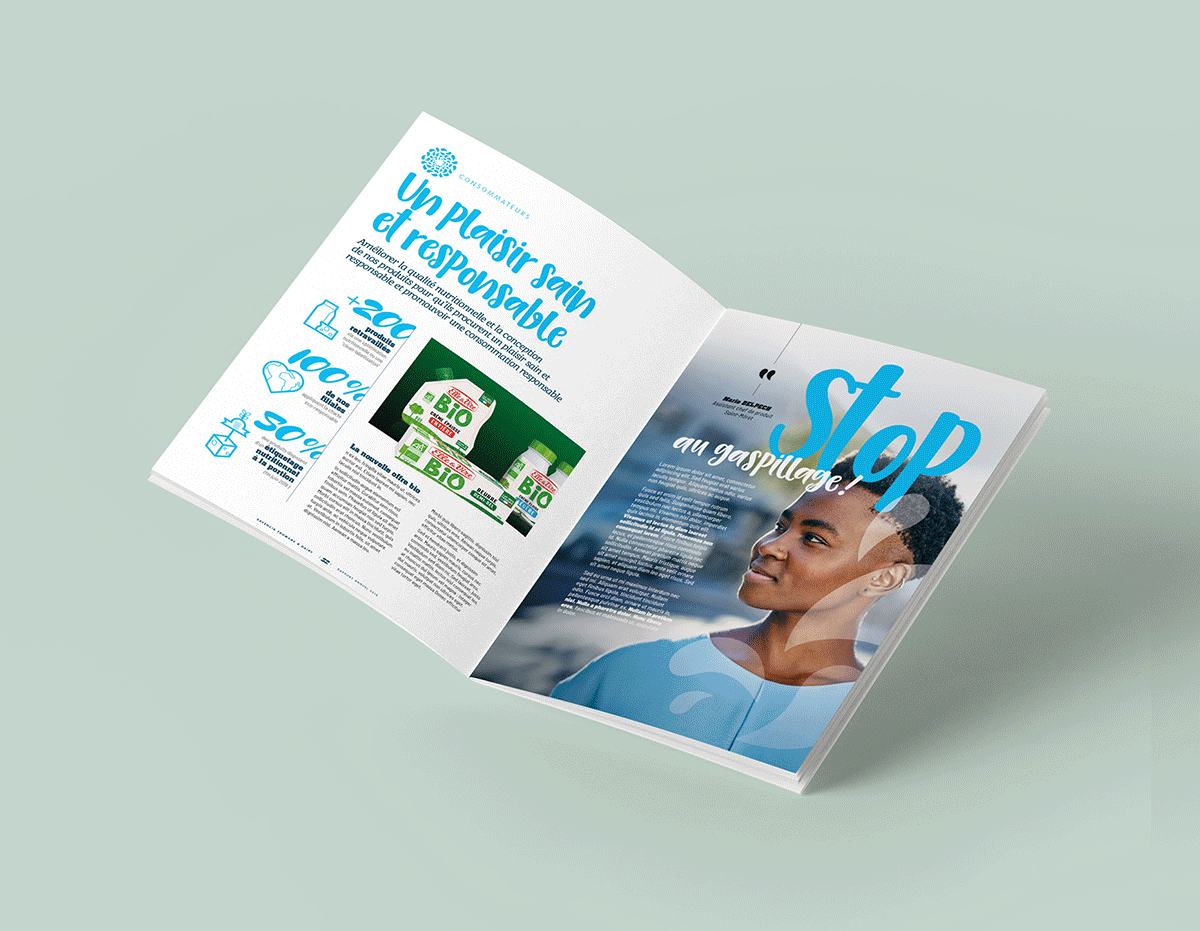 Mise en avant des produits avec de belles photos de mises en situation et des entrées de partie en pleine page, une typographie forte, une lecture aérée qui favorise les articles courts, les extraits verbatims et mise en lumière des chiffres clés, tout en faisant ressortir le côté sain et naturel de la marque.