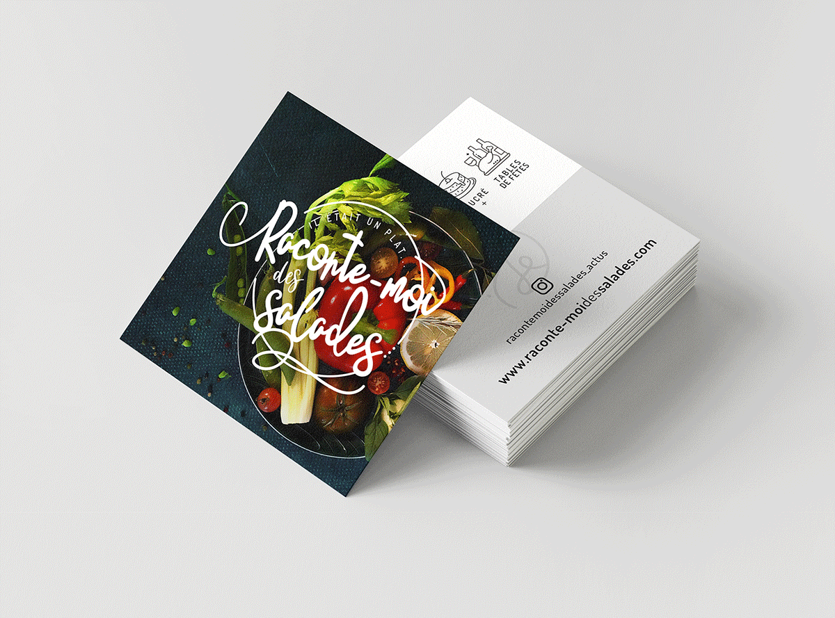 Déclinaisons d’outils print : des fiches recette téléchargeables en pdf (format A4) et des cartes de visite pour faire connaître le site