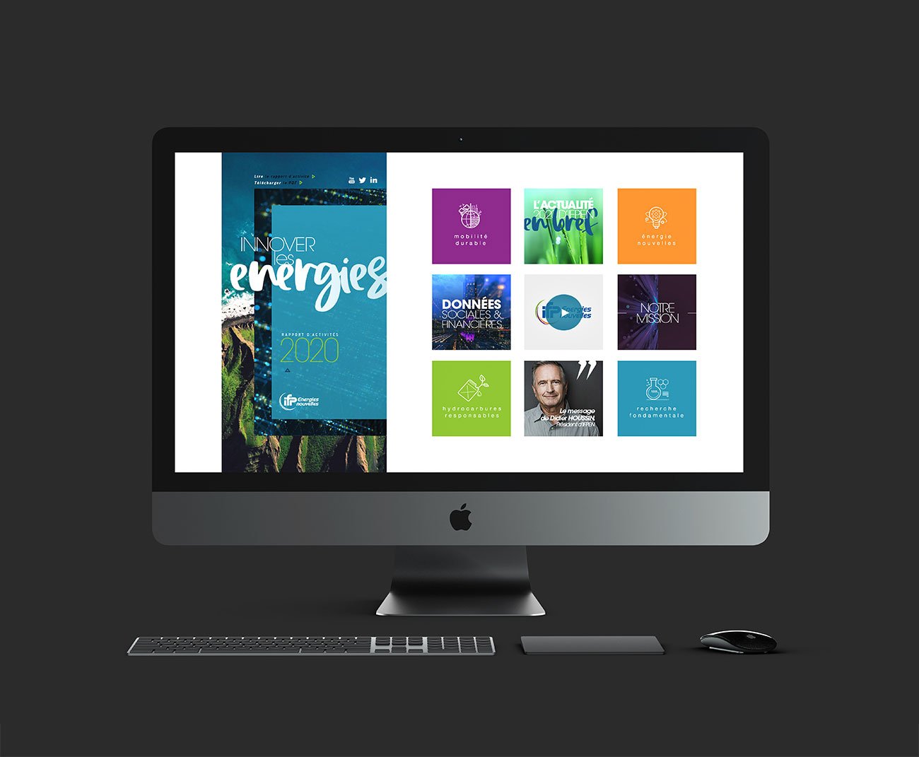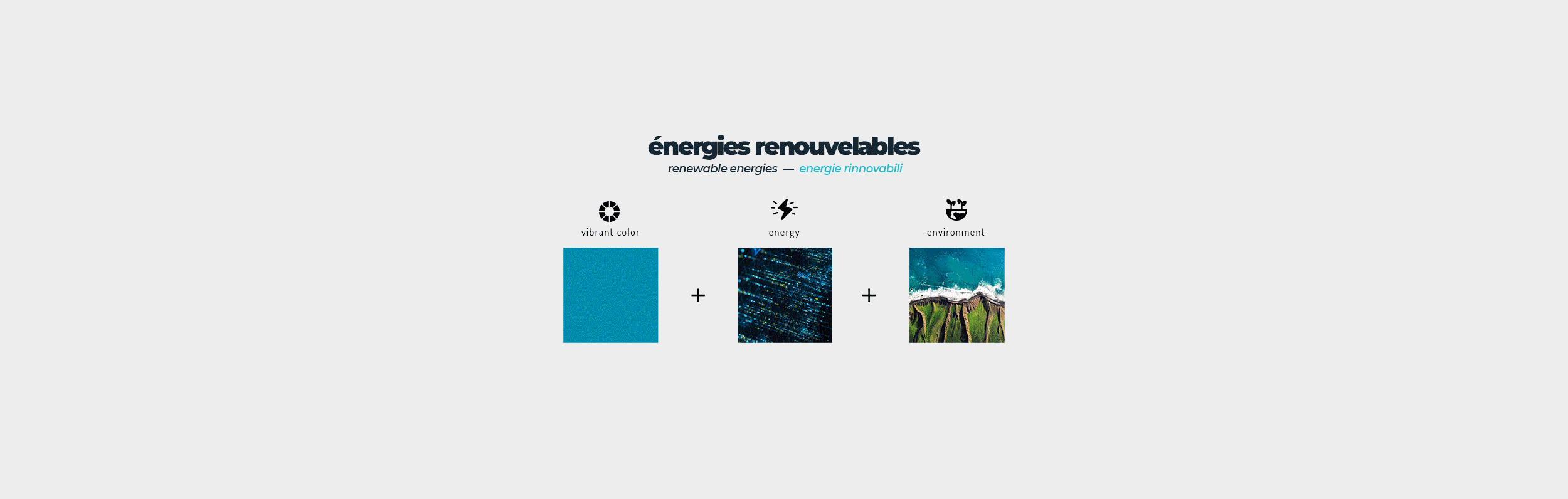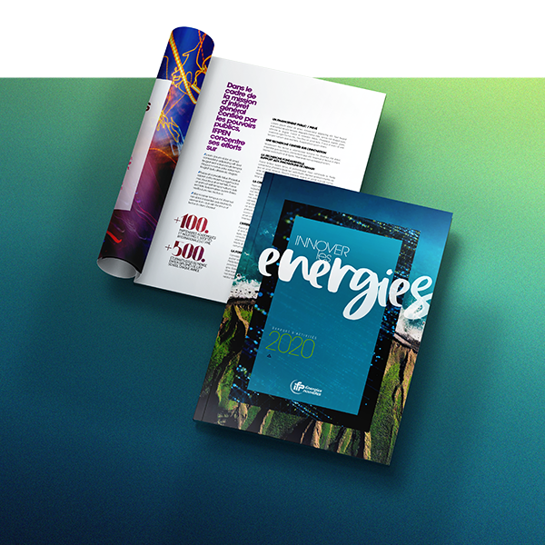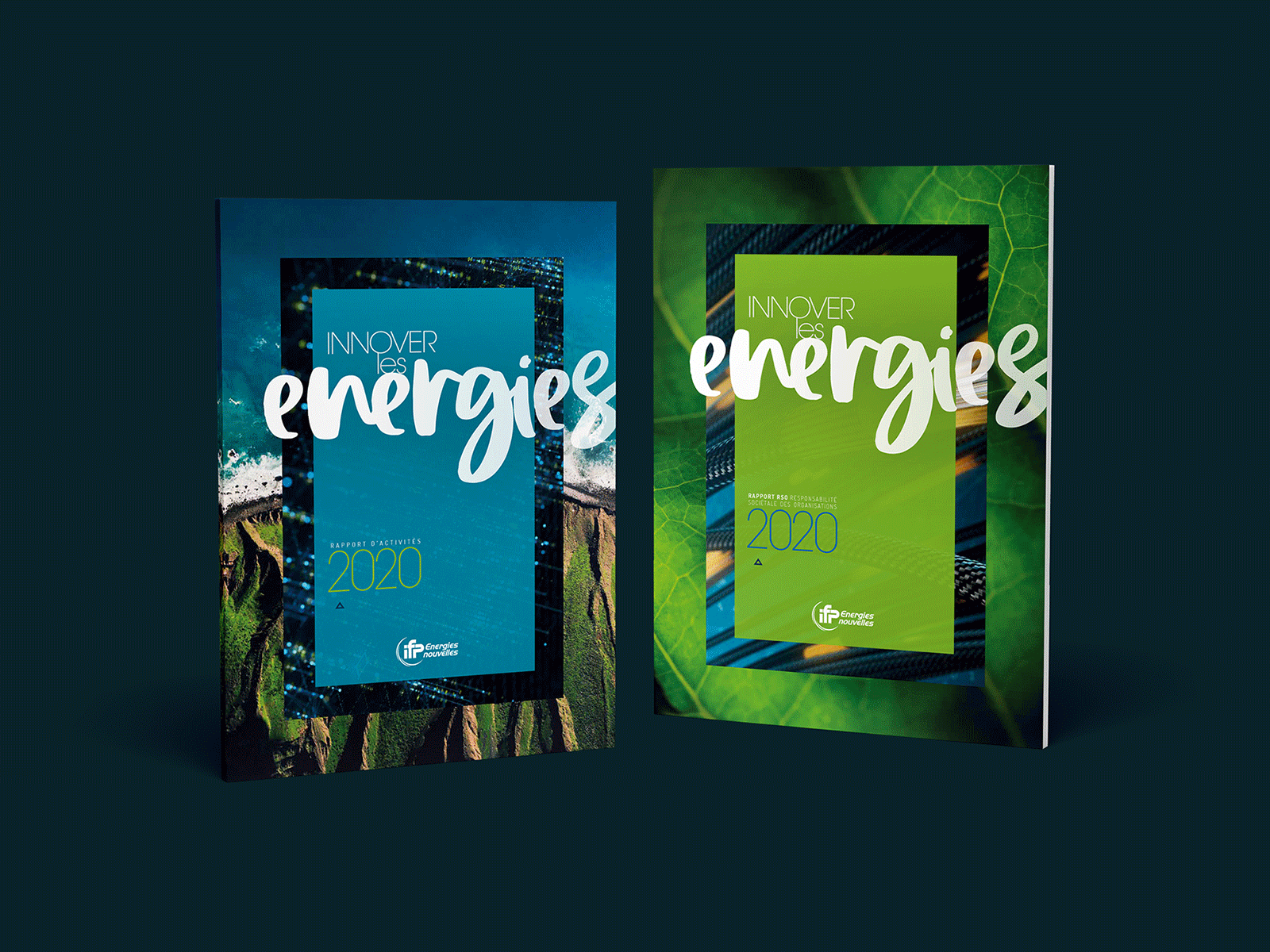 Association d’une image de nature + un visuel représentant l’énergie + un aplat de couleur pour illustrer l’énergie renouvelable sur la couverture. Jeu de superposition pour créer un “cadre” visuel fort et reconnaissable.