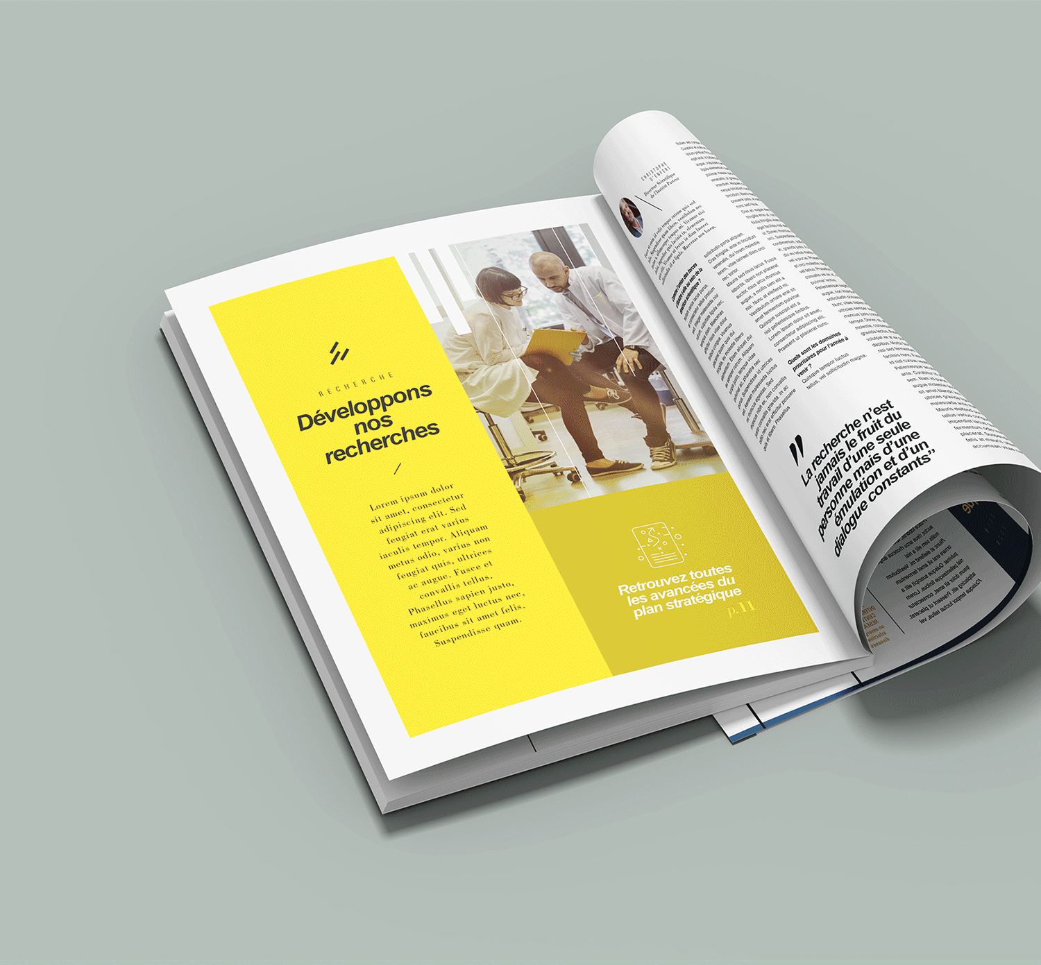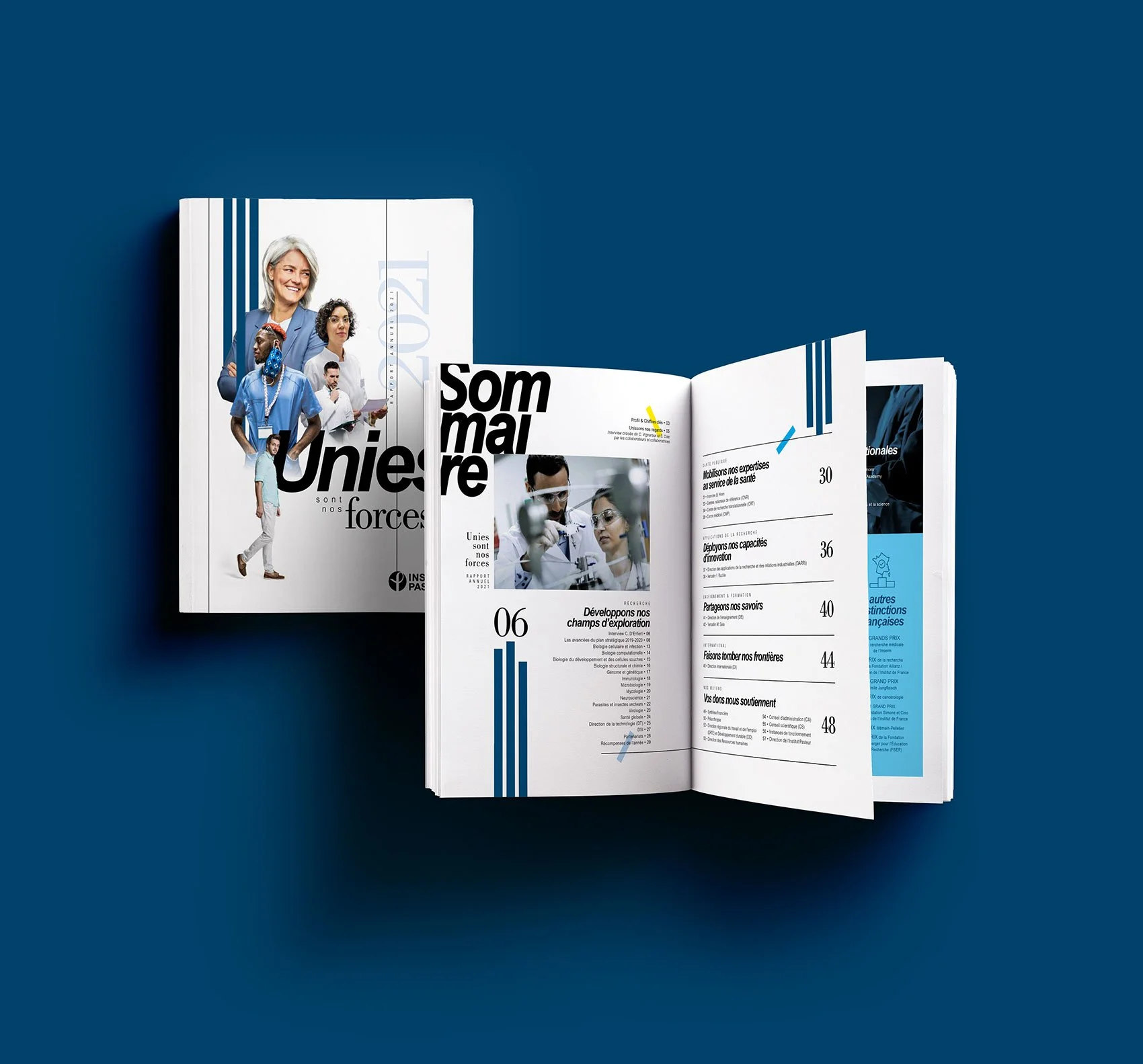 Jeu d’une triple ligne graphique pour illustrer la continuité entre les 3 rapports annuels. Contenus rythmés par des color blocks graphiques pour la double page de chiffres et les entrées de partie.