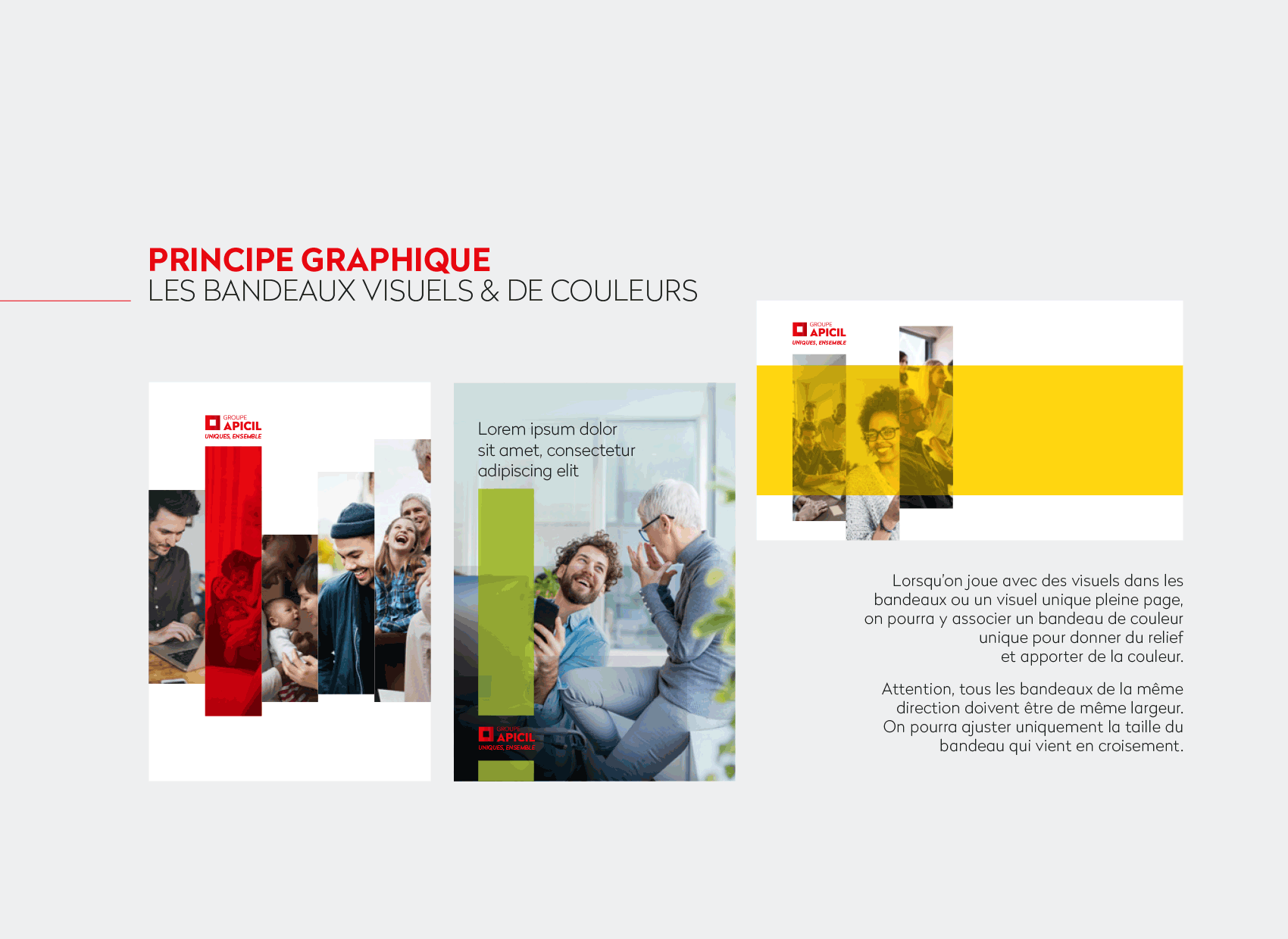 Multiplications de bandeaux, jeu de décalages, croisements et transparence, filtres de couleurs qui permettent une possibilité infinie de cadrages photos et variétés d’images pour illustrer tous les sujets : collaborateurs, environnement de travail, expressions, scènes de vie, utilisateur final, zoom sur un détail…