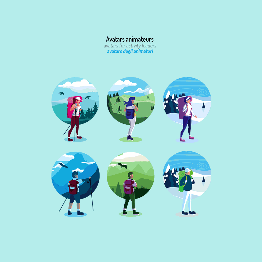 Creation of a UI kit available from the Brevo image library: collection of over fifty photo headers to vary according to activities and seasons + pictograms and section titles + all pictograms for technical information (ETR = effort, technicality, and risk levels) + 3 female and 3 male avatars to indicate the contact details of the activity leaders.
