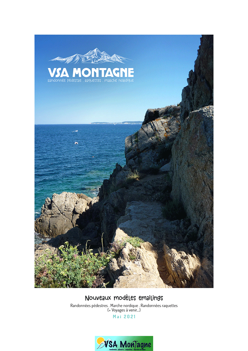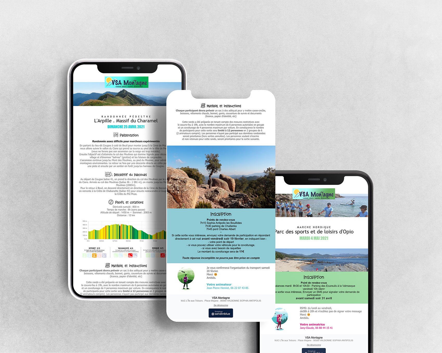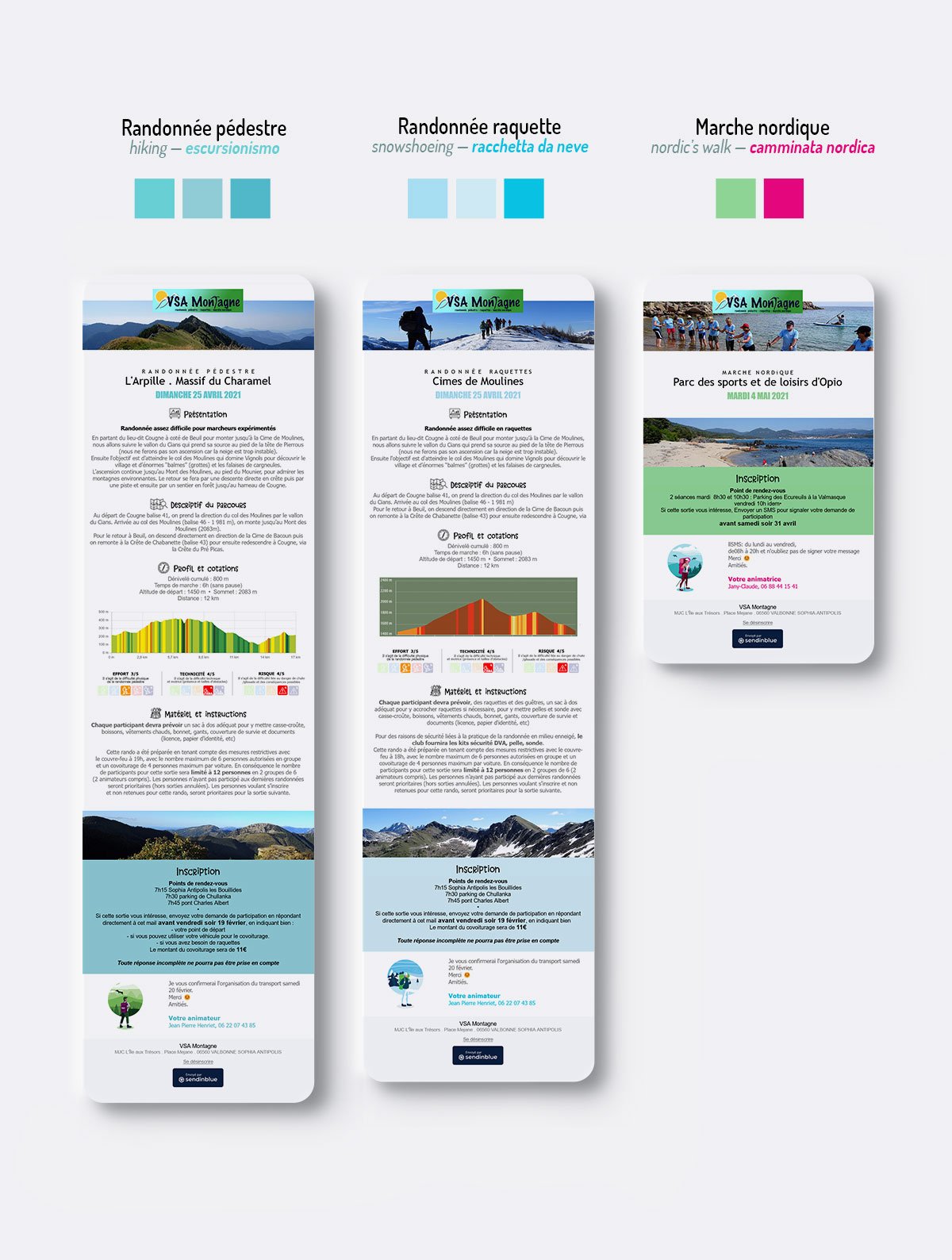 Développement de 3 modèles de newsletters pour les 3 activités proposées : randonnée pédestre, randonné raquette et marche nordique et codes couleurs associés. Préparation du compte SendinBlue (désormais Brevo) avec templates accessibles directement en ligne.