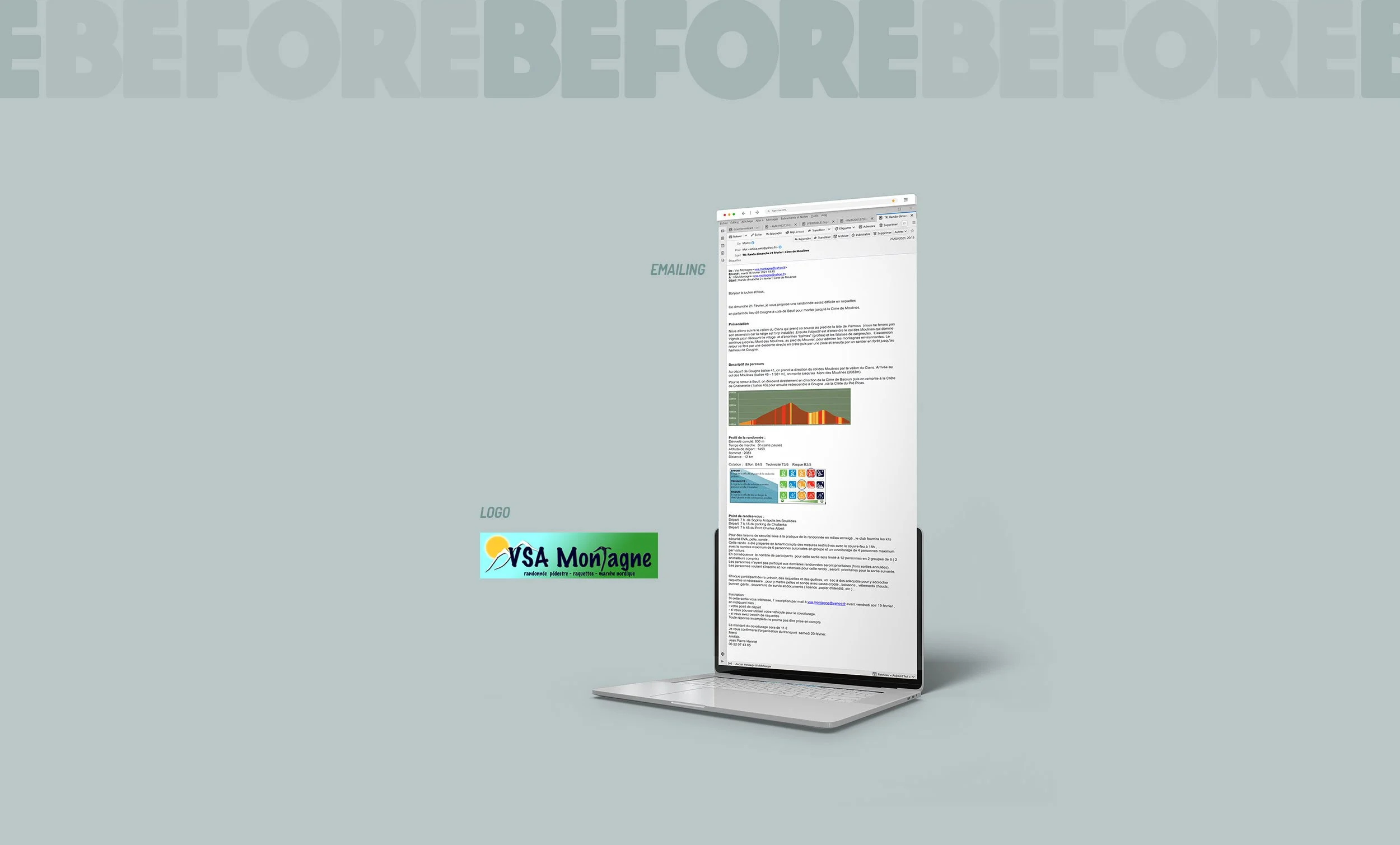Création de modèles de newsletters pour proposer les activités aux membre du club : proposition d’un nouveau logo + 3 templates de newsletters (randonnée pédestre . randonnée raquette . marche nordique) + kit UI près à intégrer sur SendinBlue/Brevo + document tutoriel en PDF pour les nouveaux animateurs - newsletters développées en 2021 et toujours utilisées et déployées par les animateurs du club