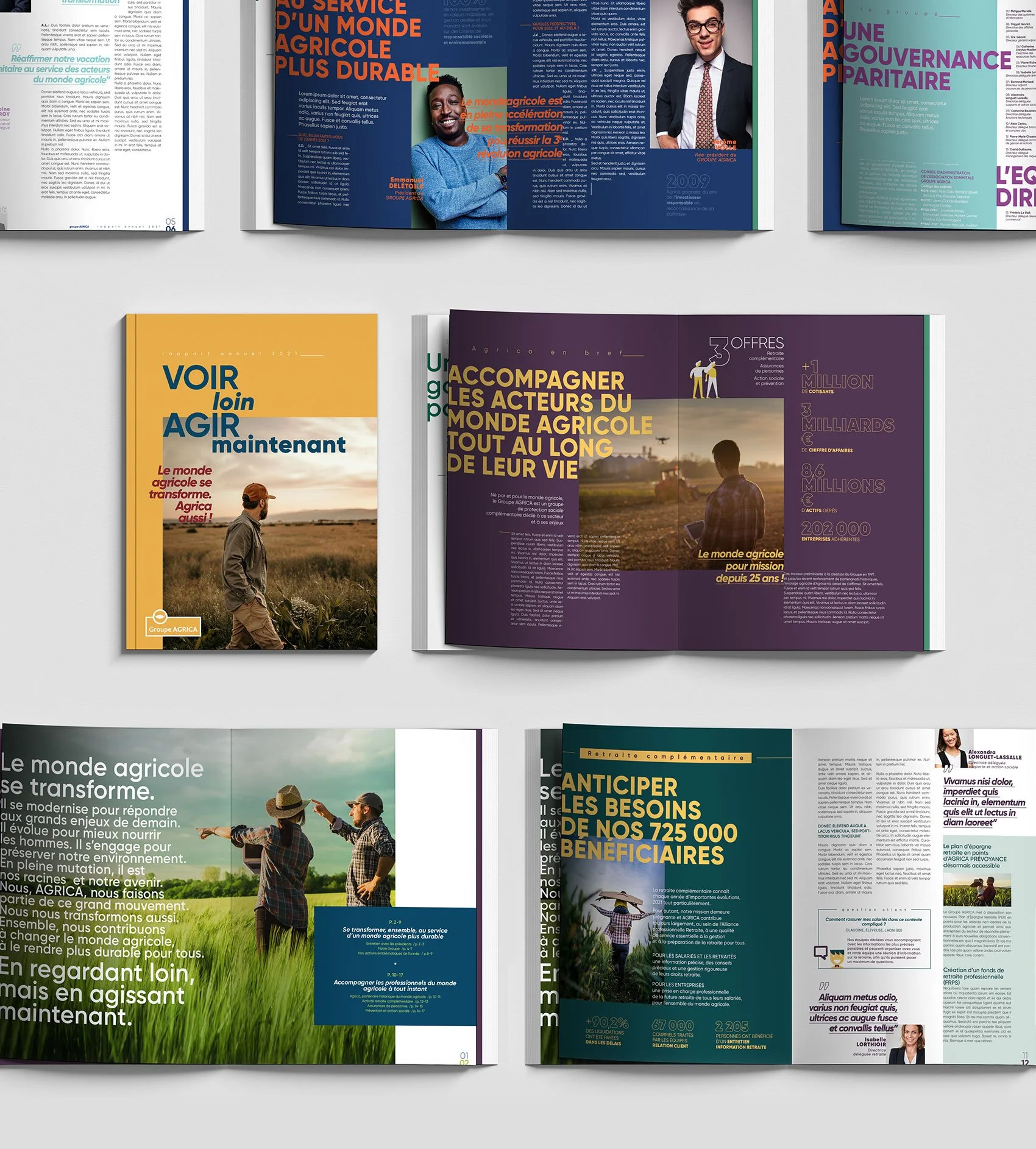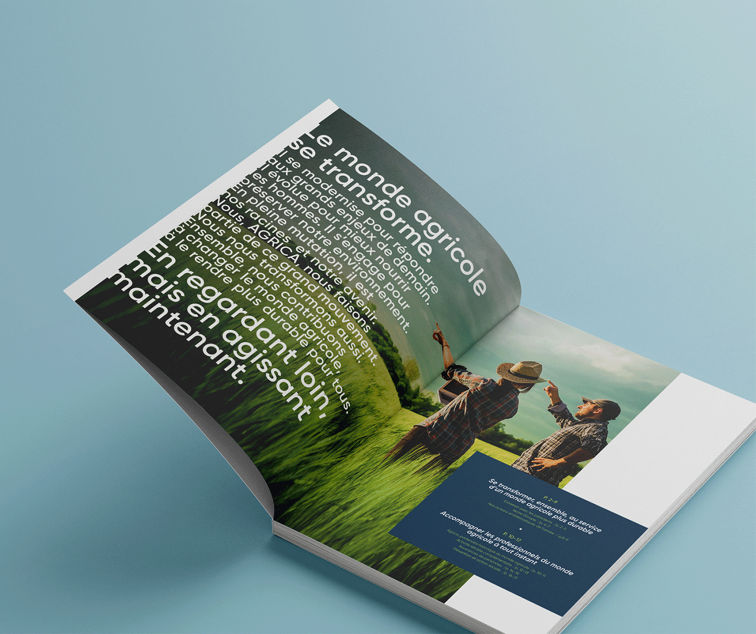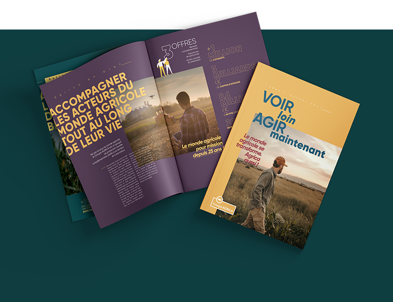 De la couleur, des jeux typographiques, une hiérarchisation des niveaux de textes et des contenus, des chiffres clés, un grand visuel d’ouverture façon manifeste : mises en pages très visuelles, colorées et modernes pour mettre en avant la transformation agricole.
